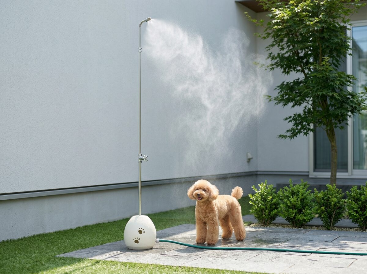 暑い季節に庭で涼しく過ごすためのミスト機能付き立水栓です。水をミスト化して噴射することで、庭の温度を下げながらペットのクールダウンにも役立ちます。また、ミストを使わない季節には通常の立水栓として使える点も魅力です。